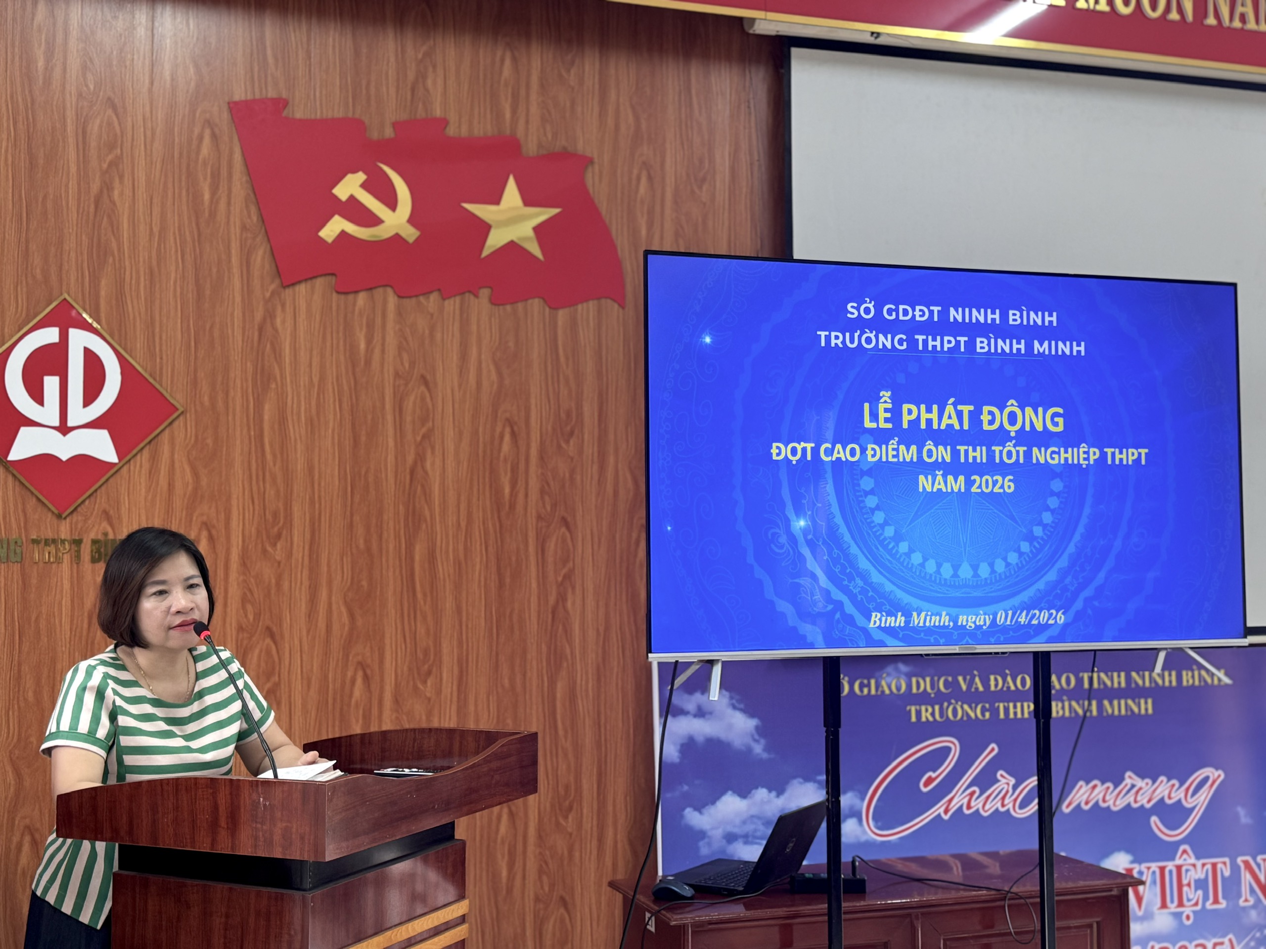 Tại hội nghị, đồng chí Nguyễn Thị Bích Nguyệt – Bí thư Chi bộ, Hiệu trưởng nhà trường đã triển khai Kế hoạch số 104/KH-BM ngày 01/04/2026 của trường THPT Bình Minh về việc phát động “Đợt cao điểm ôn thi tốt nghiệp THPT năm 2026” với những bước đi chiến lược nhằm nâng cao chất lượng kết quả thi tốt nghiệp THPT năm 2026, cụ thể các nhiệm vụ trọng tâm sau: